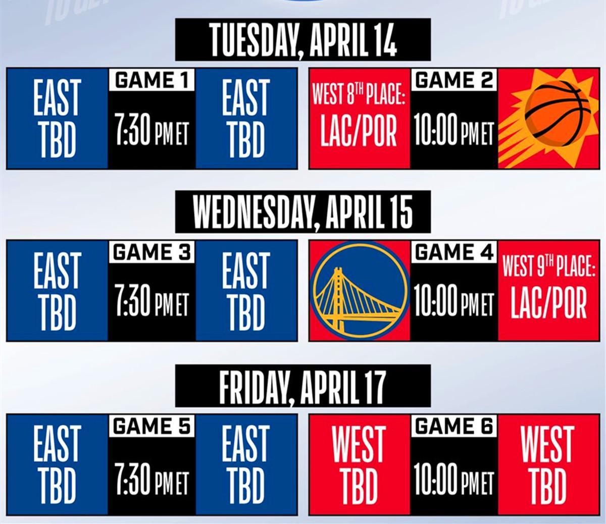 4月16日:G3 | 东部第十vs东部第九(早7点半)、G4 |勇士vs西部第九(快船/开拓者)(早10点);